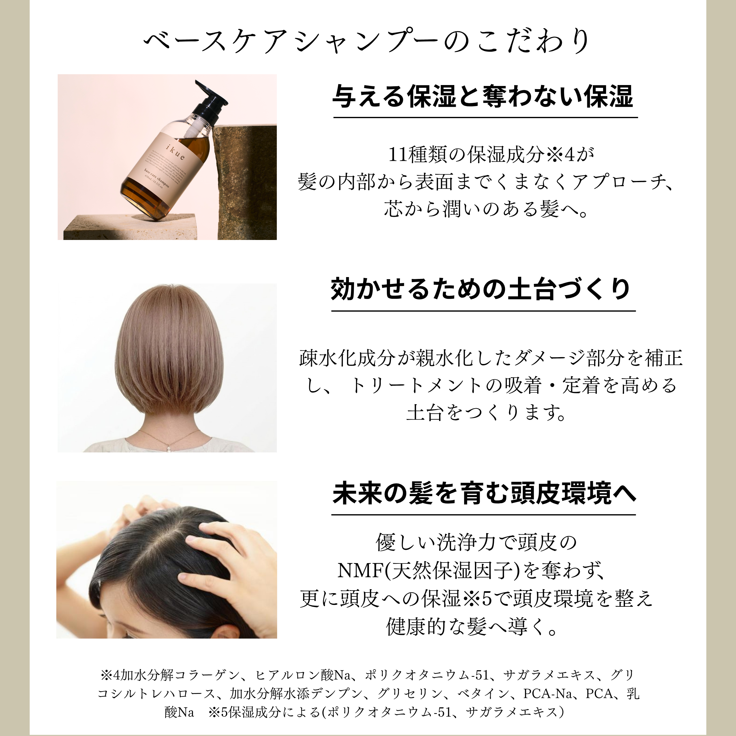 [シャンプー] 水、コカミド DEA、ココアンホ酢酸 Na、コカミドプロピルベタイン、グリセリン、ココイルメチルタウリンタウリン Na、ラウロイルメチルアラニン Na、ラウレス-4カルボン酸 Na、オレフィン(C14-16)スルホン酸 Na、ベタイン、ヒドロキシアルキル(C12-14)ヒドロキシエチルサルコシン、デシルグルコシド、PEG40-水添ヒマシ油、サガラメエキス、ヒアルロン酸 Na、加水分解コラーゲン、グリコシルトレハロース、ヘマチン、PCA-Na、乳酸 Na、ポリクオタニウム-73、ポリクオタニウム-51、加水分解水添デンプン、 (アクリル酸アミドプロピルトリモニ ウムクロリド/アクリル酸アミド)コポリマ―、カプリリルグリコール、アルギニン、アスパラギン酸、PCA、グリシン、アラニン、セリン、バリン、プロリン、トレオニン、イソロイシン、ヒスチジン、フェニルアラニン、BG、クエン酸、エタノール、安息香酸 Na、EDTA-2Na、フェノキシエタノール、メチルパラベン、香料