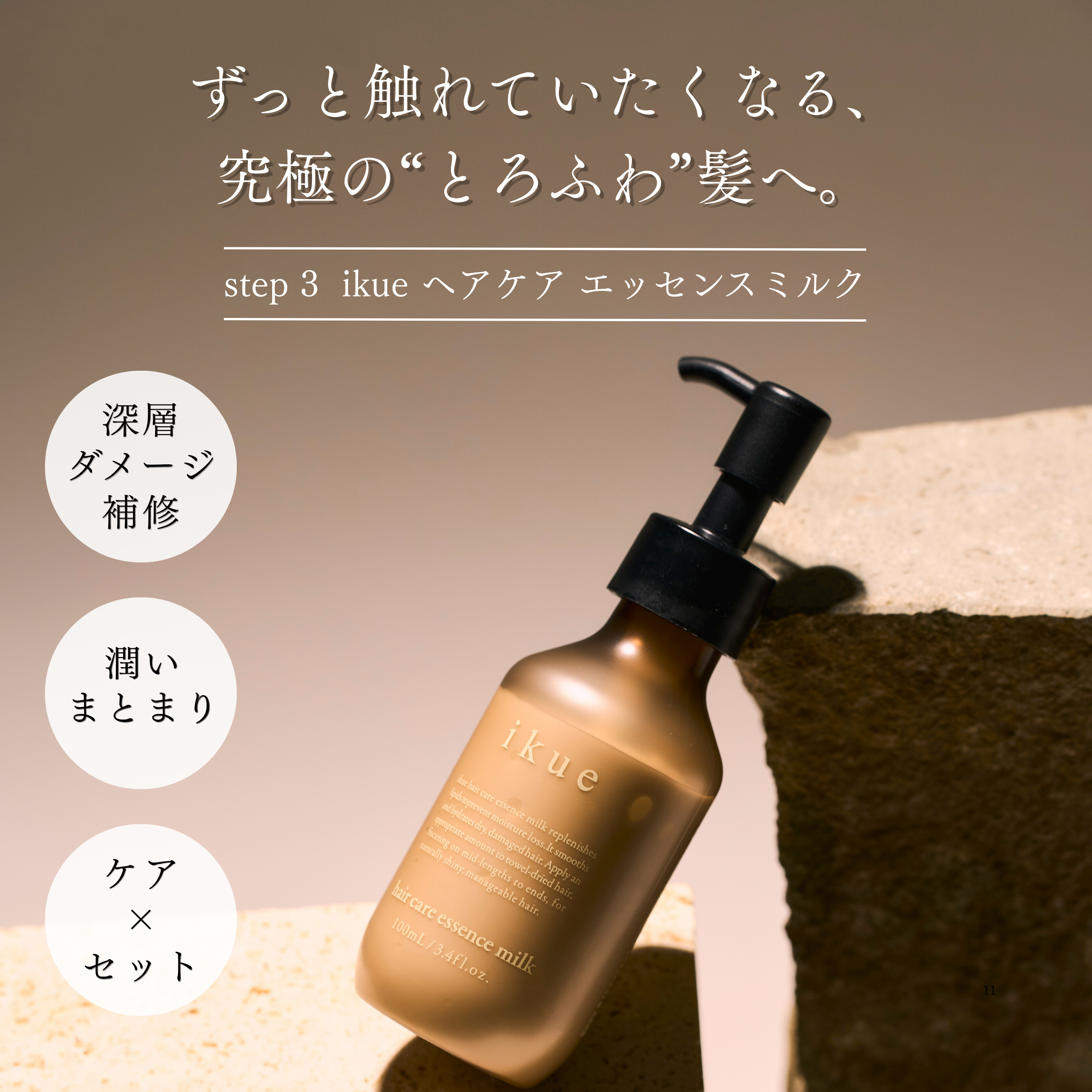ヘアセット前に髪に塗布していただくことで、自然なツヤとウエット感、まとまりを生み出します。また、熱に反応する補修成分(γ-ドコサラクトン)が、アイロンやコテの熱で髪の表面に密着し、うねりや広がり、毛先のパサつきを抑えます。