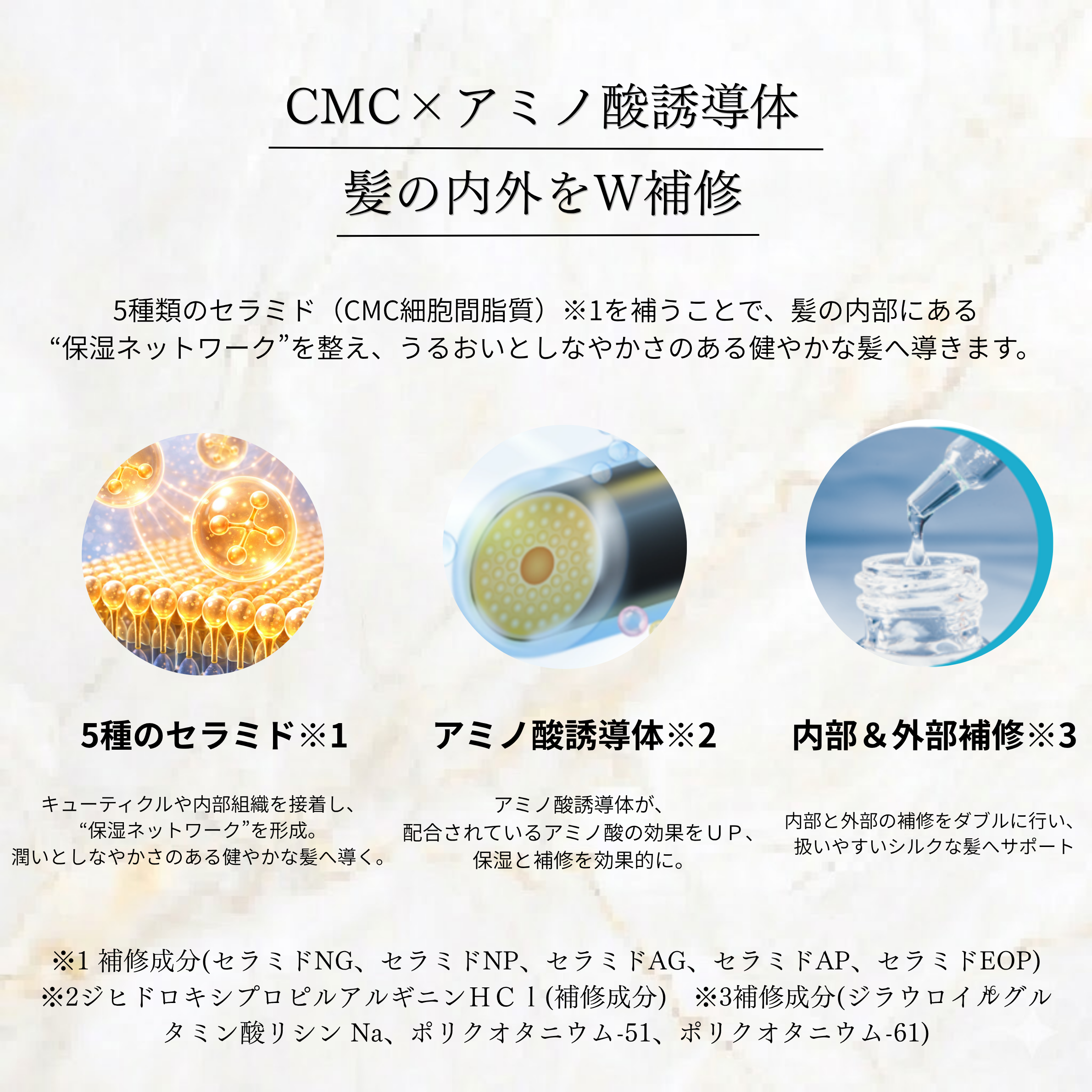 水、イソペンチルジオール、グリセリン、イソステアリン酸イソステアリル、ミリスチルアルコール、シクロペンタシロキサン、ステアルトリモニウムクロリド、ジフェニルシロキシフェニルトリメチコン、ジメチコン、セタノール、フェニルトリメチコン、ミリストイルメチルアミノプロピオン酸ヘキシルデシル、ホホバ種子油、セテアラミドエチルジエトニウム加水分解コメタンパク、セテアラミドエチルジエトニウムサクシノイル加水分解エンドウタンパク、セラミド NG、セラミド NP、セラミド AG、セラミド AP、セラミド EOP、コレステロール、γ-ドコサラクトン、ラノリン脂肪酸、ヒアルロン酸ヒドロキシプロピルトリモニウム、ジヒドロキシプロピルアルギニン HCl、ジラウロイルグルタミン酸リシン Na、グアーヒドロキシプロピルトリモニウムクロリド、ジココジモニウムクロリド、ジステアリルジモニウムクロリド、クオタニウム-33、ポリクオタニウム-51、ポリクオタニウム-61、ココイルアルギニンエチル PCA、アルギニン、アスパラギン酸、グリシン、アラニン、PCA、PCA-Na、セリン、バリン、イソロイシン、トレオニン、プロリン、ヒスチジン、フェニルアラニン、乳酸 Na、アモジメチコン、アミノプロピルジメチコン、ジメチコノール、ラウロイルグルタミン酸ジ(フィトステリル/オクチルドデシル)、トリ(カプリル酸/カプリン酸)グリセリル、PG、BG、イソプロパノール、トコフェロール、クエン酸、EDTA-2Na、フェノキシエタノール、安息香酸 Na、香料
